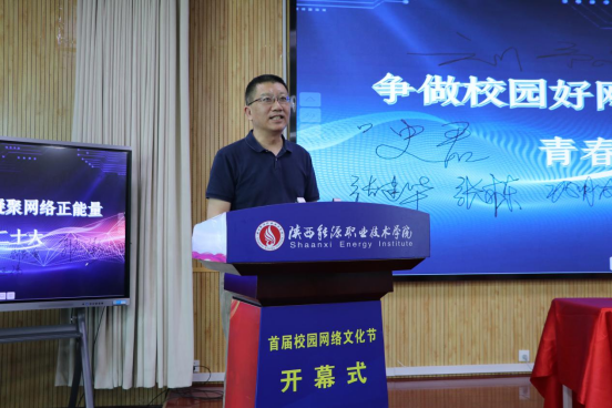 会上,任向明宣读陕西能源职业技术学院《关于举办首届校园网络文化节的通知》(陕能院党宣〔2022〕9号)。智信学院郝宇刚作为承办单位代表发言,学生代表陈思敏宣读《营造绿色健康网络环境 争做校园好网民》倡议书。与会领导及学生代表分别在电子横幅“争做校园好网民 凝聚网络正能量 青春献礼二十大”上签名。