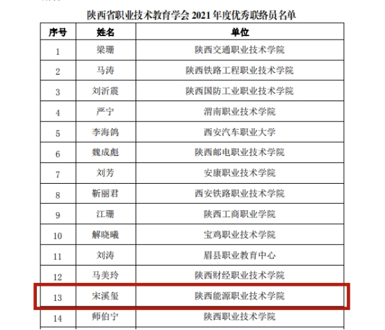宋溪玺,陕西能源职业技术学院党政办秘书科副科长,负责陕西省职业技术教育学会与学院联络工作。作为联络员,能够时刻遵守政治纪律,保持良好工作作风,做好保密工作,认真履行工作职责:2021年全年转呈办理学会文件、通知等工作共(69)件次,及时向学院转呈学会各类文件资料,反馈学会下发的工作任务并且督促相关工作部门及时办理,按规定的时间要求和质量要求,及时向学会上报学院工作进度及完成情况。日常工作中,随时关注职教学会发布的相关信息,积极配合学会完成各项工作,充分发挥了协调联络作用。