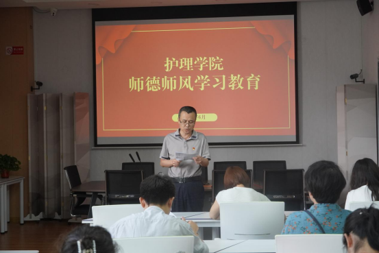 随后,护理学院党总支副书记巩明发带领护理学院全体教职工认真学习了《习近平总书记关于师德师风的重要论述摘编》中“在看望参加政协会议的医药卫生界教育界委员时的讲话(2021年3月6日)”部分的内容,共同领悟讲话精神。