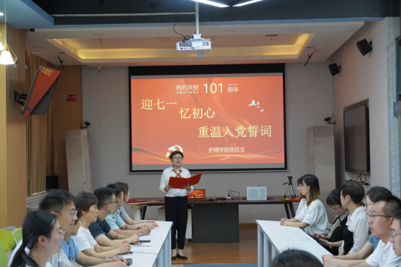 为庆祝中国共产党成立101周年,深入学习贯彻习近平新时代中国特色社会主义思想和党的十九届六中全会精神,巩固拓展党史学习教育成果,充分发挥基层党组织战斗堡垒作用和广大党员先锋模范作用,2022年7月1日,护理学院党总支在临潼校区教师发展中心开展了“迎七一 忆初心 重温入党誓词”主题党日活动。