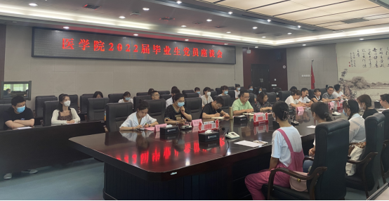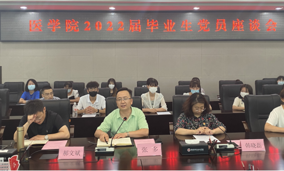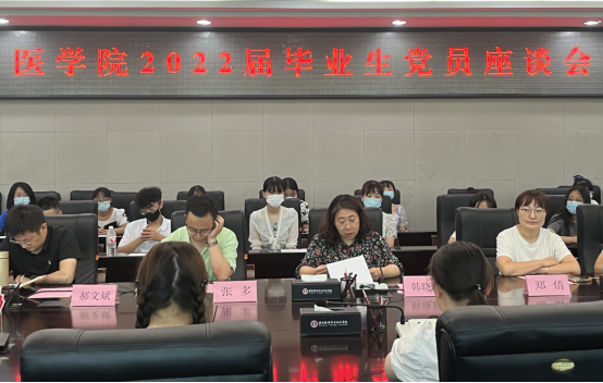 为做好毕业生离校关怀,教育毕业生党员在今后的工作岗位中继续发挥好先锋模范作用,7月10日下午,医学院2022届毕业生党员座谈会在办公楼第三会议室召开,医学院党总支副书记韩晓磊,医学院党总支宣传委员、教工支部书记张多,医学院党总支教工支部组织委员、教学办主任郝文斌,医学院党总支学工党支部书记郑倩,组织委员伊龙、全体党员教师及32名毕业生党员,会议由伊龙主持。
