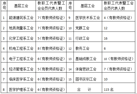 根据学院实际情况和工作需要,经学院党政工联席会议研究,第二届教职工代表大会暨工会会员代表大会代表人数确定为115人,定于2016年11月29日至12月5日进行陕西能源职业技术学院第二届教职工代表大会暨工会会员代表大会代表的选举工作,请各基层工会按照要求,认真做好此项工作。