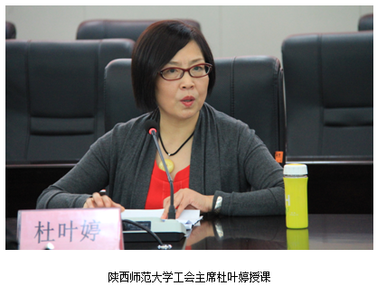 陕西师范大学工会主席杜叶婷受邀为培训班授课,杜主席从工会法律法规、工会基础知识和习近平总书记在中央首次召开群团工作会议上的讲话等,结合自己的实际工作,就如何认真履职、创新发展向大家进行了全面细致的讲解。