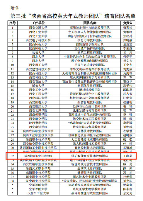 近日,陕西省教育厅印发《陕西省教育厅关于公布第三批“陕西省高校黄大年式教师团队”培育团队名单的通知》(陕教函〔2026〕20号)文件,我校丁海英教授负责的煤矿智能开采技术教师团队入选第三批“陕西省高校黄大年式教师团队”培育团队。