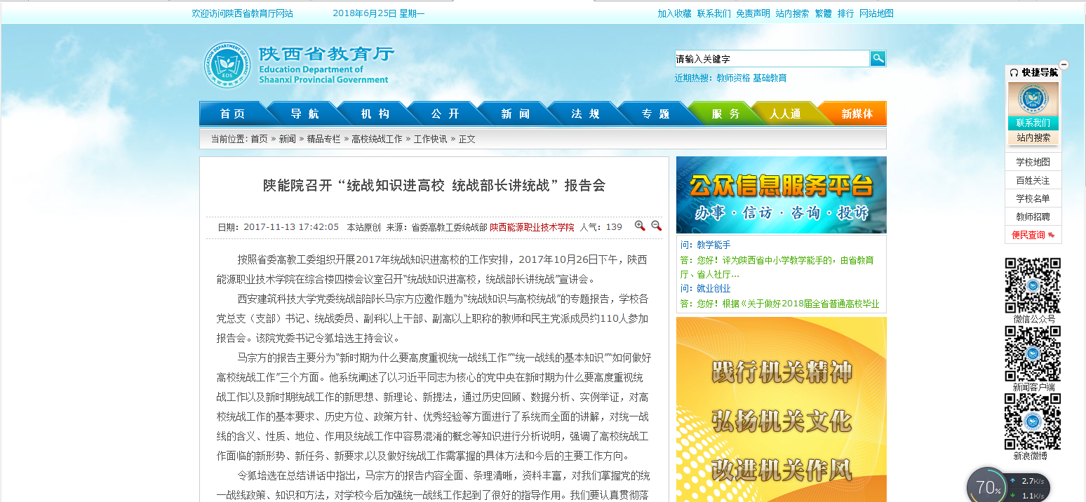 按照省委高教工委组织开展2017年统战知识进高校的工作安排,2017年10月26日下午,陕西能源职业技术学院在综合楼四楼会议室召开“统战知识进高校,统战部长讲统战”宣讲会。