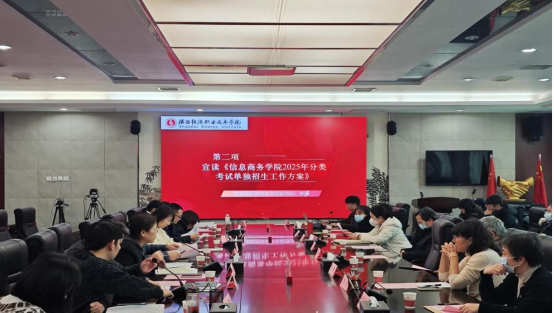随后,学院党总支副书记陈强宣读了《信息商务学院2025年分类考试单独招生工作方案》。该方案明确了分类考试单独招生的具体流程、要求及时间安排,为学院招生工作的规范化、制度化、信息化提供了有力保障,并部署了安康市各区县招生团队的组建安排,要求各小组精准对接、全速开拓、有力拓展资源,高效实施招生工作。陈强还就寒假期间学生相关工作进行了安排,强调了假期期间学生安全、学业指导及社会实践等方面的重要性,要求全体辅导员及任课教师要切实履行职责,确保学生度过一个充实、安全的假期。