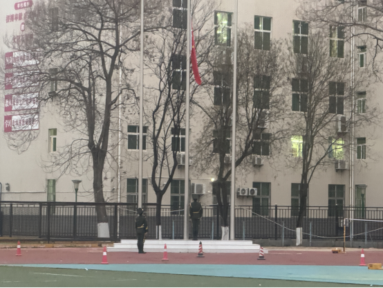 升旗仪式现场,全体师生有序列队集结,按指定站序整齐排列,整场仪式庄重肃穆。随着主持人宣布仪式开始,国旗班迈着铿锵正步走向旗杆,在雄壮的国歌声中,五星红旗冉冉升起,全体师生脱帽肃立、行注目礼并齐唱国歌,爱国情怀在现场每个人心中激荡。
