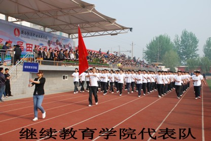 在开幕式上继续教育学院代表队伴随着激昂的运动员进行曲,以统一的着装,整齐的步伐,饱满的精神和响亮的口号走过主席台,显示着新时代校企联合办学“订单”培养学员的特有气质和勇于进取的精神,展现了继续教育学院学生积极向上的精神面貌,赢得了主席台领导的阵阵掌声。