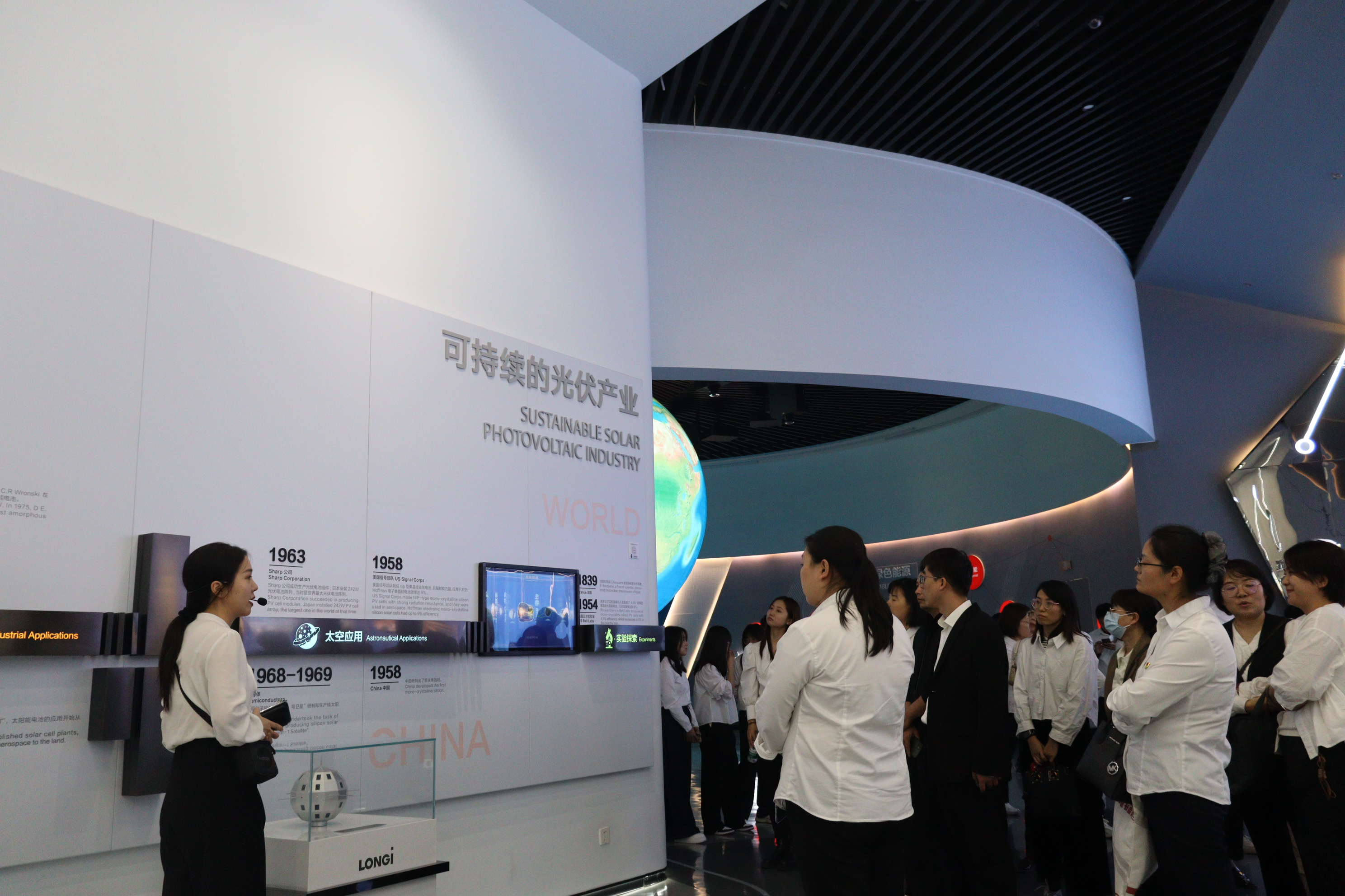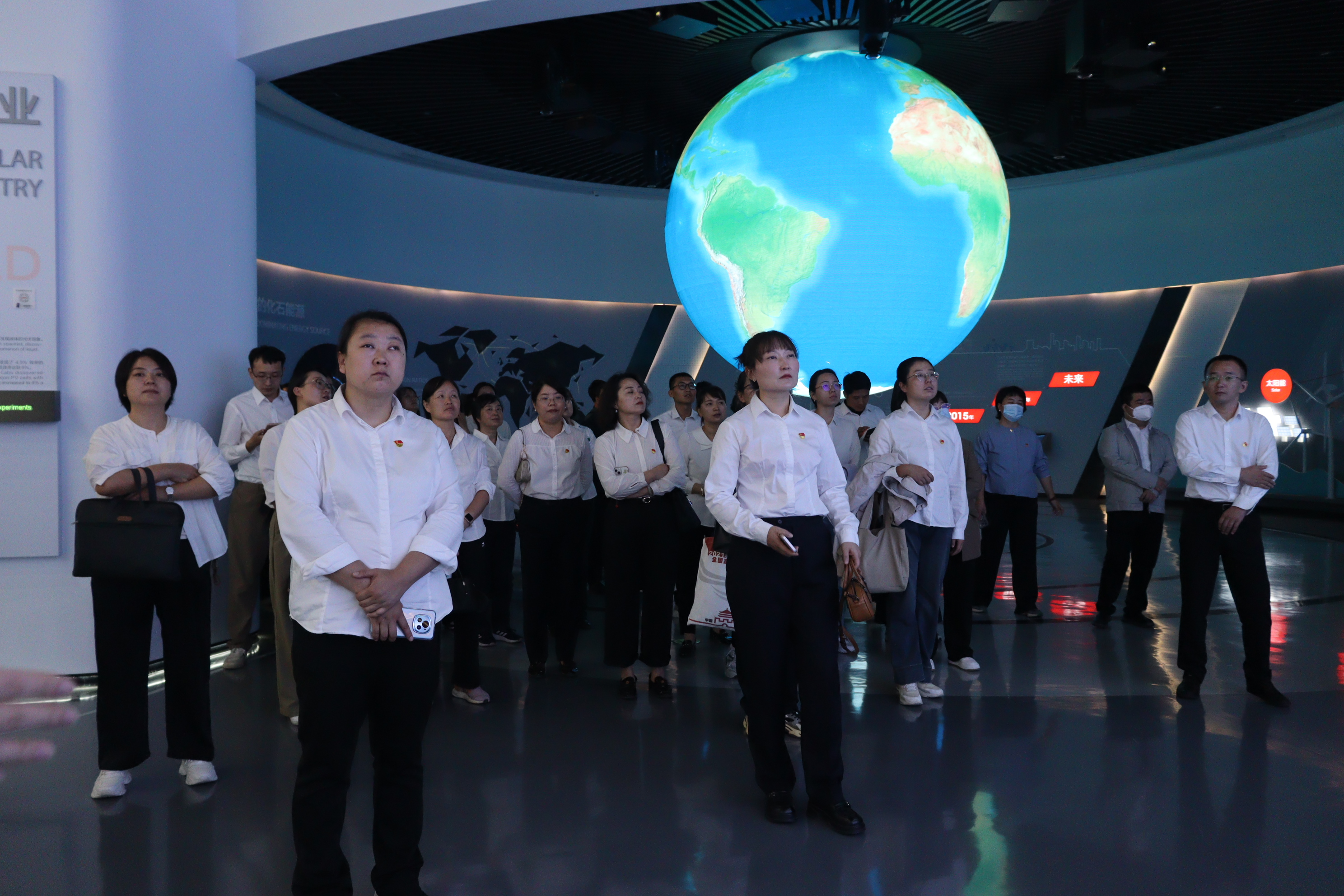 随后,教师们参观了隆基绿能智慧能源展览馆,深入地了解了企业的发展历史、技术创新以及取得成就。参观过程中,大家通过全息投影及三维动画等方式直观感受了太阳能电池板从原料提纯、硅片切割到封装测试的生产全过程,就直拉晶、金刚线切割及双面光伏板等新技术与现场工作人员积极进行交流。作为国内光伏产业的龙头企业,隆基致力于通过科技创新推动光伏和氢能行业发展,实现全球零碳目标。教师们通过走进隆基、了解隆基,对光伏企业和新能源行业在我国经济发展过程中的重要地位和实际意义有了更深层次的理解,领悟了技术革新与新质生产力之间的关系,为今后的教学和科研工作提供了新的思路和方向。