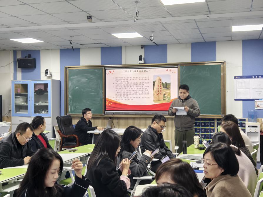 随后,孙晨浩同志聚焦生态保护主题开展专题领学。他系统梳理了“绿水青山就是金山银山”理念的形成历程与实践价值,结合《关于深入贯彻落实习近平总书记来陕考察重要讲话重要指示精神全面加强秦岭生态环境保护工作的决定》,着重强调秦岭作为“中央水塔”“中华民族祖脉”的特殊生态地位。同时,他对《陕西省秦岭生态环境保护条例》中的分区管控模式、禁止性规定及法律责任等核心条款进行逐条解读,引导教师深刻认识生态保护的政治责任与法治义务,明确需将绿色发展理念融入课程教学、思政教育全过程,助力学生树立生态保护意识。