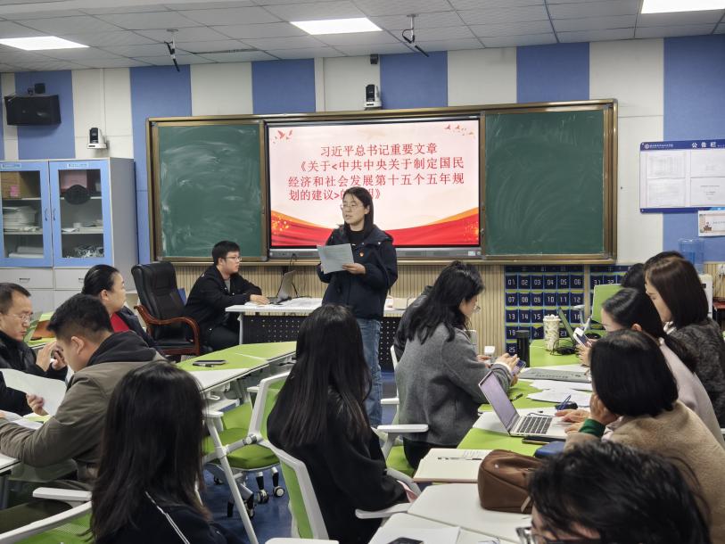 学习伊始,王倩同志围绕习近平总书记重要文章《关于<中共中央关于制定国民经济和社会发展第十五个五年规划的建议>的说明》开展系统领学。她从 “十五五”规划的重要历史地位切入,详细解读了规划起草坚持的目标导向、系统思维等四大原则,结合规划草案中产业升级、科技创新、民生保障等12个领域的战略任务,阐释了中国式现代化建设接续推进的实践路径。她谈到,“十五五”规划作为未来五年职业教育对接国家战略需求指明了方向,教师需立足岗位找准人才培养与国家发展的结合点,将规划精神转化为优化课程设置、创新教学模式的具体思路。