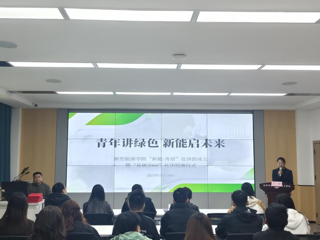 为深入贯彻落实“双碳”战略目标,扎实推进“一院一品”校园文化品牌“碳索未来 新能启航:校园绿色工匠培育工程”建设,打造具有新型能源学院鲜明特色的育人名片,2025年10月30日,学院在实训楼一楼博约堂隆重举行“新能·青语”宣讲团成立暨“易碳3060”社团授旗仪式。学院党总支副书记冯帅、孟卓,全体辅导员以及宣讲团、社团全体骨干成员共同见证了这一重要时刻。本次活动由学工办主任王倩主持。