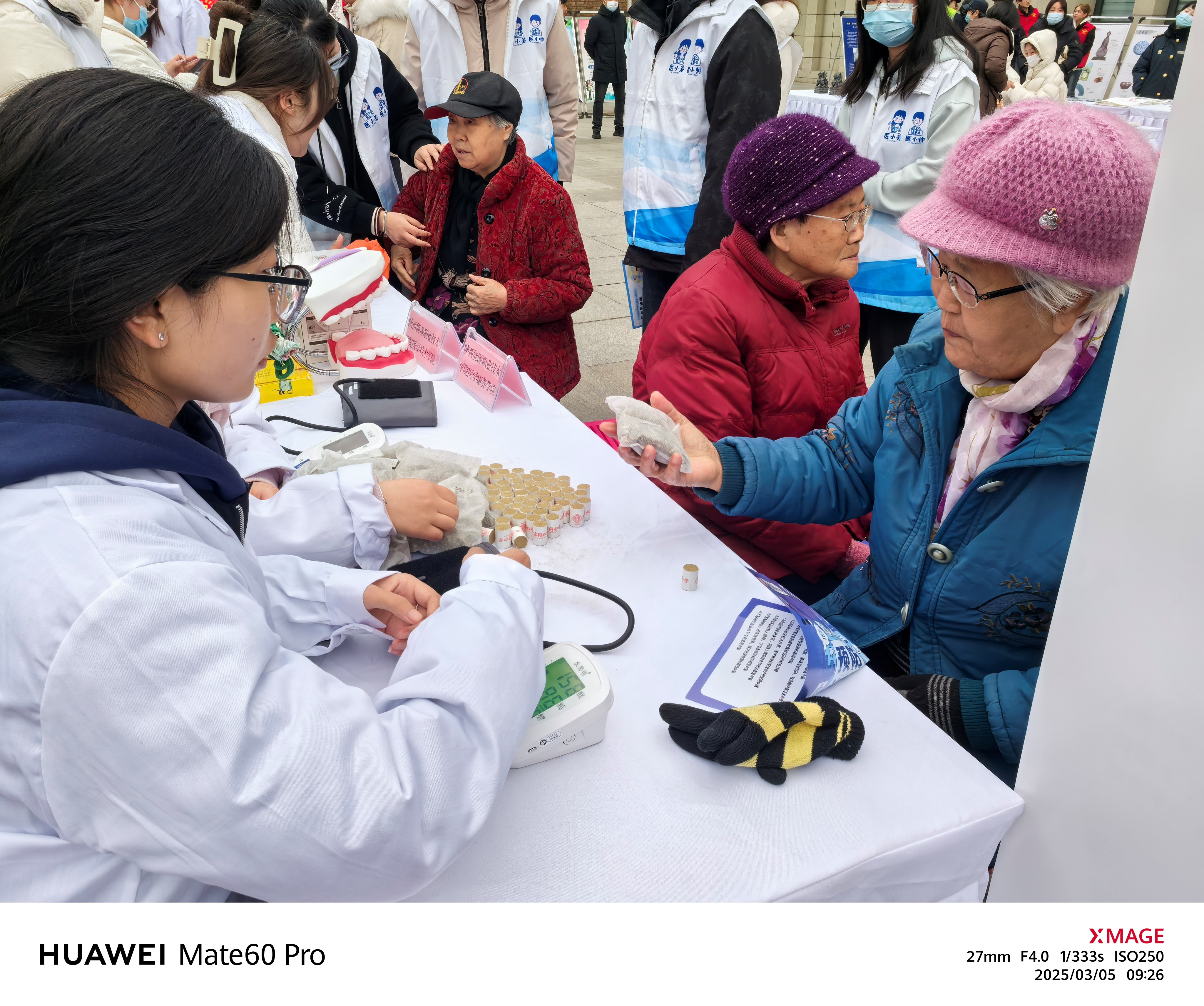 医学技术学院健康“医+1”志愿服务队在咸阳市三普社区搭建义诊区域,为市民提供血压、血糖测量等健康服务。志愿者们凭借扎实的专业素养,耐心询问居民身体状况,细致讲解健康知识,提供个性化的饮食与运动建议。口腔专业的同学们还化身“口腔健康小卫士”,现场演示巴氏刷牙法,传授科学刷牙技巧,帮助居民掌握正确的口腔护理方法。此次活动不仅提升了居民的健康意识,也让学生们在实践中深化了对“奉献、友爱、互助、进步”志愿服务精神的理解。