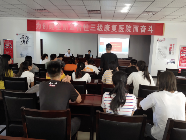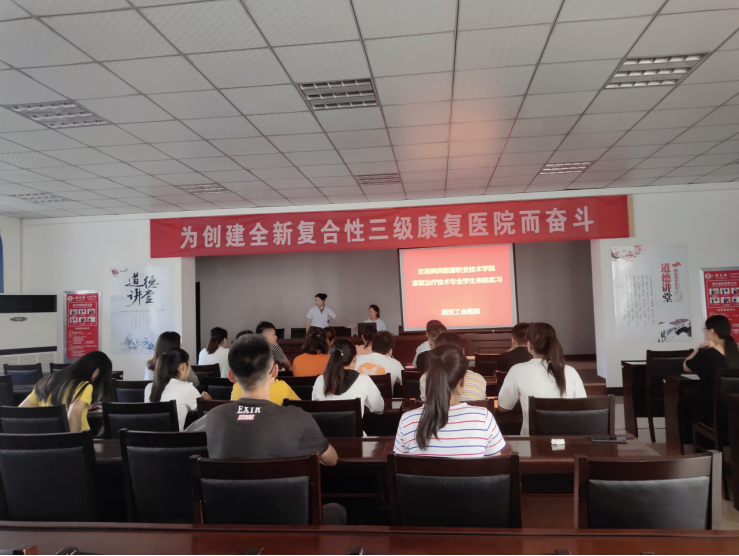 西安工会医院医教科医务部干事崔艺久、康复评定治疗科治疗师长郭燕妮在门诊楼教室对20名康复治疗技术专业实习生开展了实习动员大会,会上对医院进行了初步介绍,使学生对医院有一个初步认识;接着实习生进行自我介绍,其次崔干事、郭治疗师长分别对实习生提出了实习要求,最后对实习生进行了岗前培训。