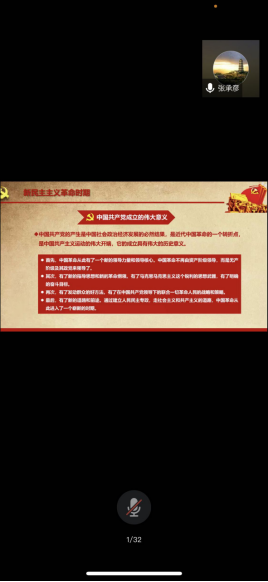 张承彦老师分别从新民主主义革命时期(1919年五四运动-1949年10月新中国成立),社会主义革命和建设时期(1949年10月-1976年10月)以及改革开放和社会主义现代化建设新时期(1976年10月-至今)讲述了党的奋斗历史。历史事实雄辩的告诉我们,没有共产党就没有新中国,只有社会主义才能救中国,只有改革开放才能发展中国,发展社会主义,发展马克思主义,只有中国共产党才是中国特色社会主义事业的坚强领导核心。