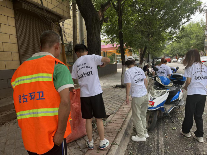 回去的路上,遇到环卫工人,队员们纷纷上前,帮助他们捡落叶、纸屑和烟头。