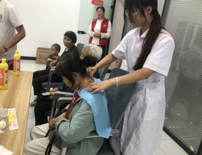 7月14日一大早,陕西能源技术学院“康养先锋”志愿服务实践团的志愿者们在宜园社区开展志愿服务,为前来参加活动的社区居民提供知识科普、推拿针灸、测量血压等服务。宜园社区的服务大厅内,坐满了前来参加义诊社区居民。