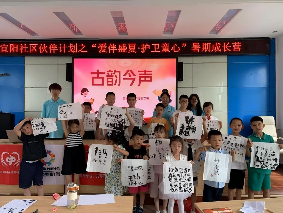 立足社区实际需求,实践队联合宜园社区、宜阳社区及宜君仁悦社工服务中心,构建“高校+社区+社工组织”协同服务模式,形成资源互补、分工协作的服务合力。团队在宜园社区开展“诗韵陶趣,童梦飞扬”活动,通过诗词大会让孩子们在游戏中学习古诗词,联合非遗传承人指导陶艺制作,让传统文化浸润童心
