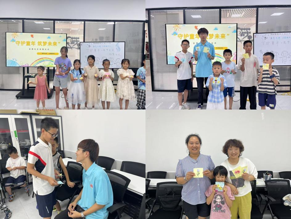 实践队联合宜园社区开展儿童夏令营结营仪式成果展示环节通过照片、视频回顾孩子们的精彩瞬间,小朋友表演《感恩的心》手势舞表达感恩。知识科普环节,孩子们演唱自编急救知识歌曲,学习急救技能手工折纸环节,孩子们专注折玫瑰花,结营通过成果展示、文艺表演、知识科普、手工互动及总结颁奖等环节,为社区服务画上圆满句号。