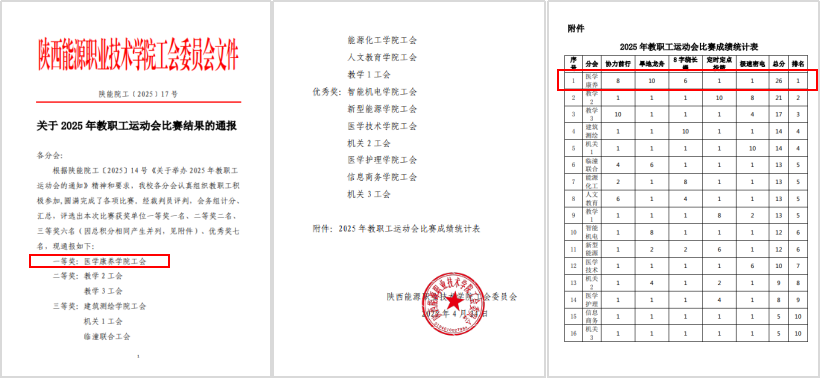 在2025年教职工运动会中,医学康养学院工会的教职工团队凭借出色的表现和团结协作的精神,一举获得团体一等奖,充分展现了教职工昂扬向上的精神风貌和追求卓越的竞技水平。