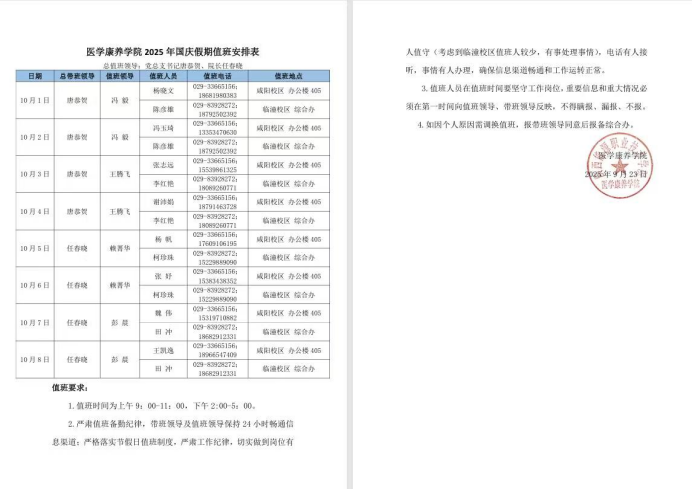 放假期间,学院安排专人值班,及时处理紧急事务。如有突发事件,请及时联系值班人员,具体见值班表。