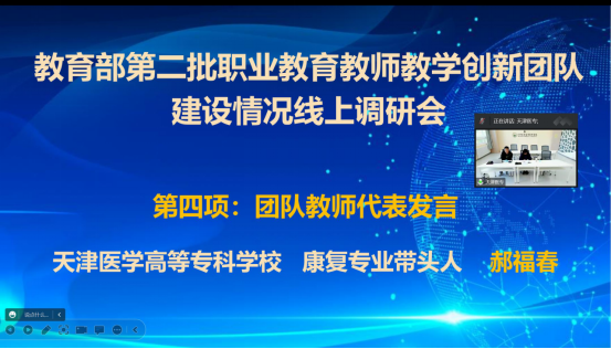 天津医学高等专科学校国际教育学院院长、医学护理学院副院长、创新团队主持人许有华发言,从创新团队基本情况、创新团队建设的目标定位、工作开展情况,建设过程中存在的问题四个方面汇报了创新团队建设情况,分享了天津医学高等专科学校教师教学创新团队在“加强师德师风建设,打造德技双馨创新团队”“探索团队建设运行机制,保障团队可持续发展”“加强课程建设,提升团队的“三教”改革能力”“以传统康复技术的“鲁班工坊”建设为核心,提升团队国际化水平”等方面取得成绩及经验做法等。
