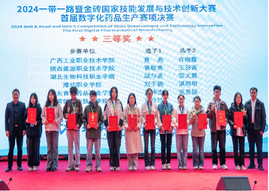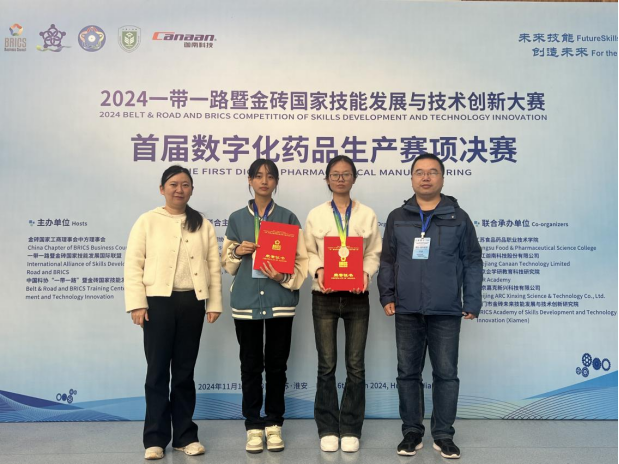 11月16日至19日,“2024一带一路暨金砖国家技能发展与技术创新大赛”首届数字化药品生产赛项决赛在江苏食品药品职业技术学院举行。本次大赛,来自全国21个省(自治区、直辖市)56所院校的112名参赛选手参加。由我校现代康养学院制药教研室教师李磊、窦欣指导的药品2201班曹敏青、王羽茜两名同学组成的参赛队,经过不懈努力和顽强拼搏,凭借良好的专业素养和沉着冷静的临场发挥,以优异成绩荣获全国三等奖。