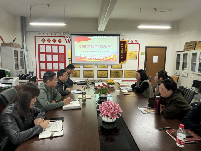 悠悠75载,风雨同舟;泱泱75载,铸就辉煌;浩浩75载,见证成长。为热烈庆祝中华人民共和国成立75周年,深入学习贯彻党的二十大和二十届三中全会精神,切实落实立德树人根本任务,弘扬爱国主义教育,激发教师爱国热情,现代康养学院党总支教工党支部于10月23日下午16:00在办公楼409开展庆祝建国75周年主题党日活动,会议由教工党支部书记赖菁华主持。