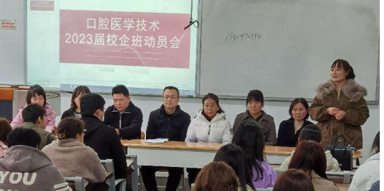 为了进一步增强校企班学生的责任意识,快速适应校企班的学习和生活,2月20日,口腔医学技术专业在教学楼109召开2023届校企班动员会。学院党总支书记巩明发、副书记韩晓磊、副院长李蕊、梁爽、教学办主任赵星、学工办主任郑倩、口腔教研室教师、口腔2023届校企班辅导员及全体同学50余人参会。会议由口腔教研室主任董伟主持。