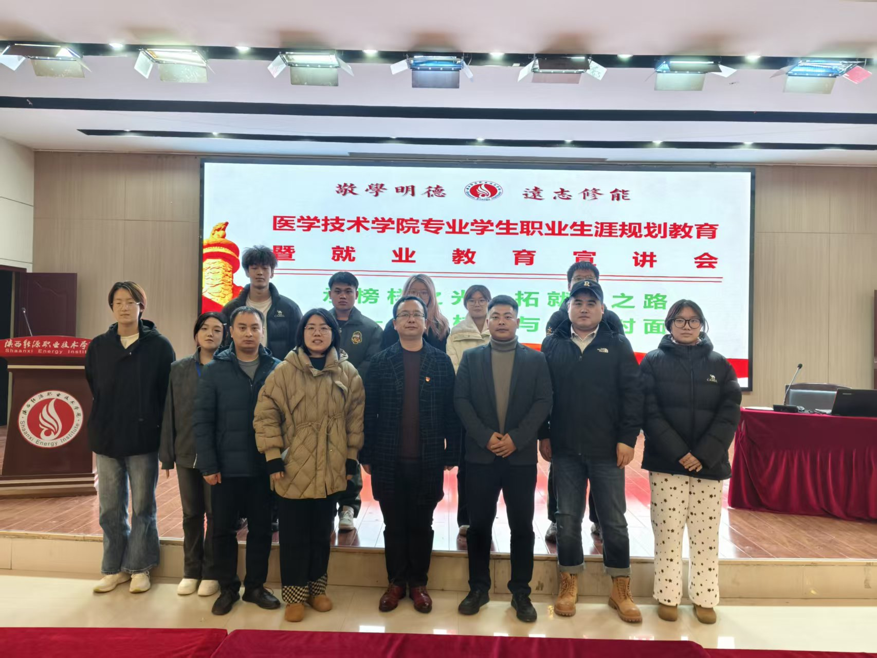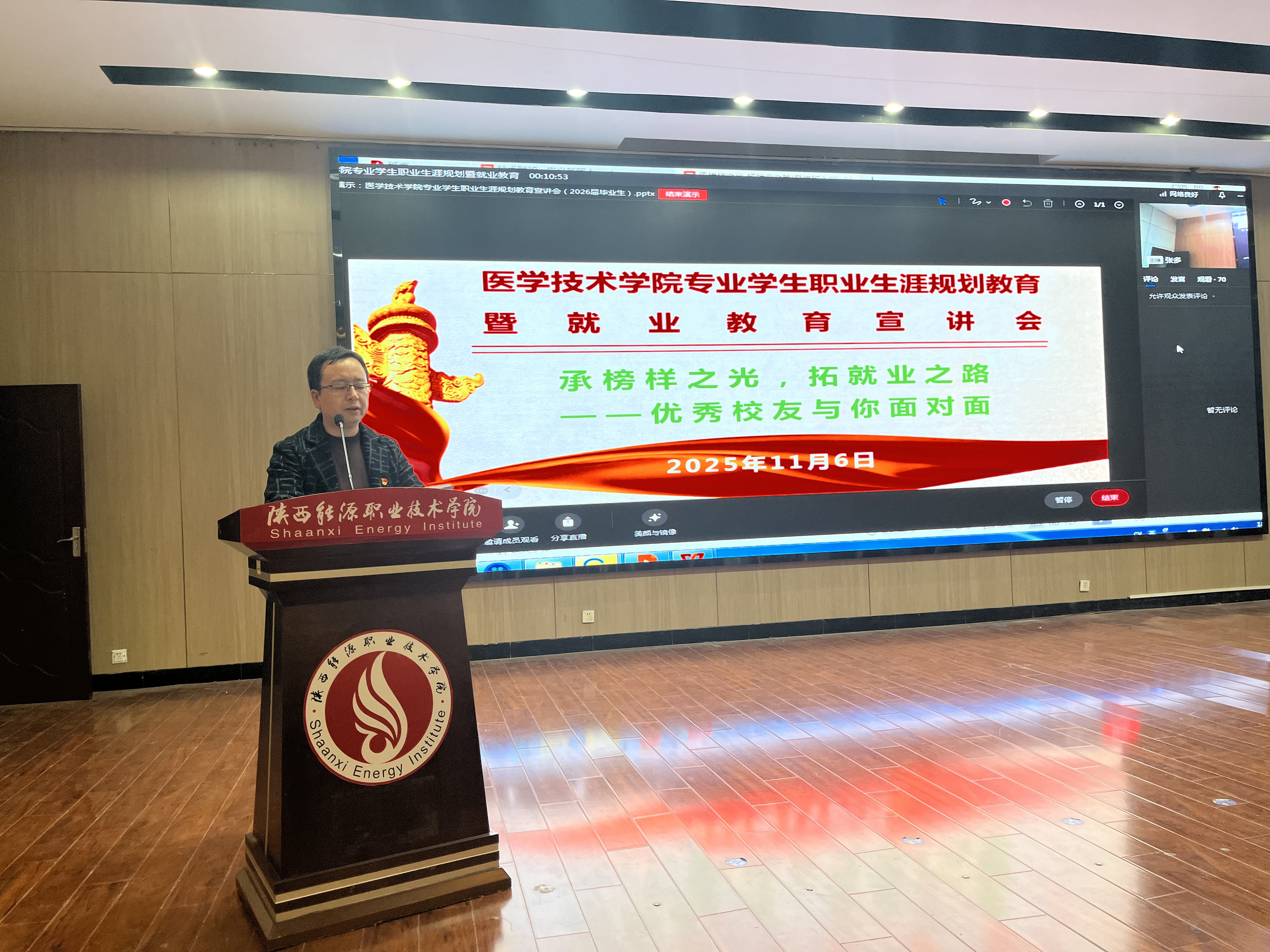 11月6日,医学技术学院在第一实训楼六楼报告厅成功举办 “承榜样之光,拓就业之路——优秀校友与你面对面”职业生涯规划教育暨就业教育宣讲会。本次宣讲会特邀陕西东宸臻美医疗科技有限公司总经理程东雷与数字化设计中心主管袁孟轩两位优秀校友倾情分享,采取线上线下相结合方式进行,医学技术学院党总支副书记张多、学工办主任蒋文、班主任以及全体口腔专业学生参会,活动由张多主持。